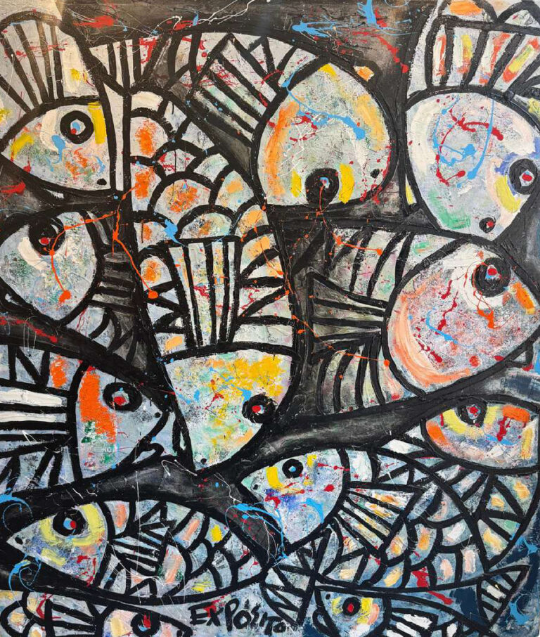 Su universo visual está poblado por rostros y cabezas enigmáticas, de una rica variedad morfológica. Estos personajes, solitarios o acompañados, con trazos notables, esgrafiados y un colorido abigarrado dentro de contornos definidos, evocan tanto máscaras rituales como los rostros cotidianos de la memoria. Un elemento distintivo son los ojos multiplicados, que observan, vigilan y se protegen, reflejando la condición humana en un mundo actual de mirada penetrante. A veces, estos seres se coronan con peces, crustáceos o aves, guiños a su entorno natural y cultural de origen.